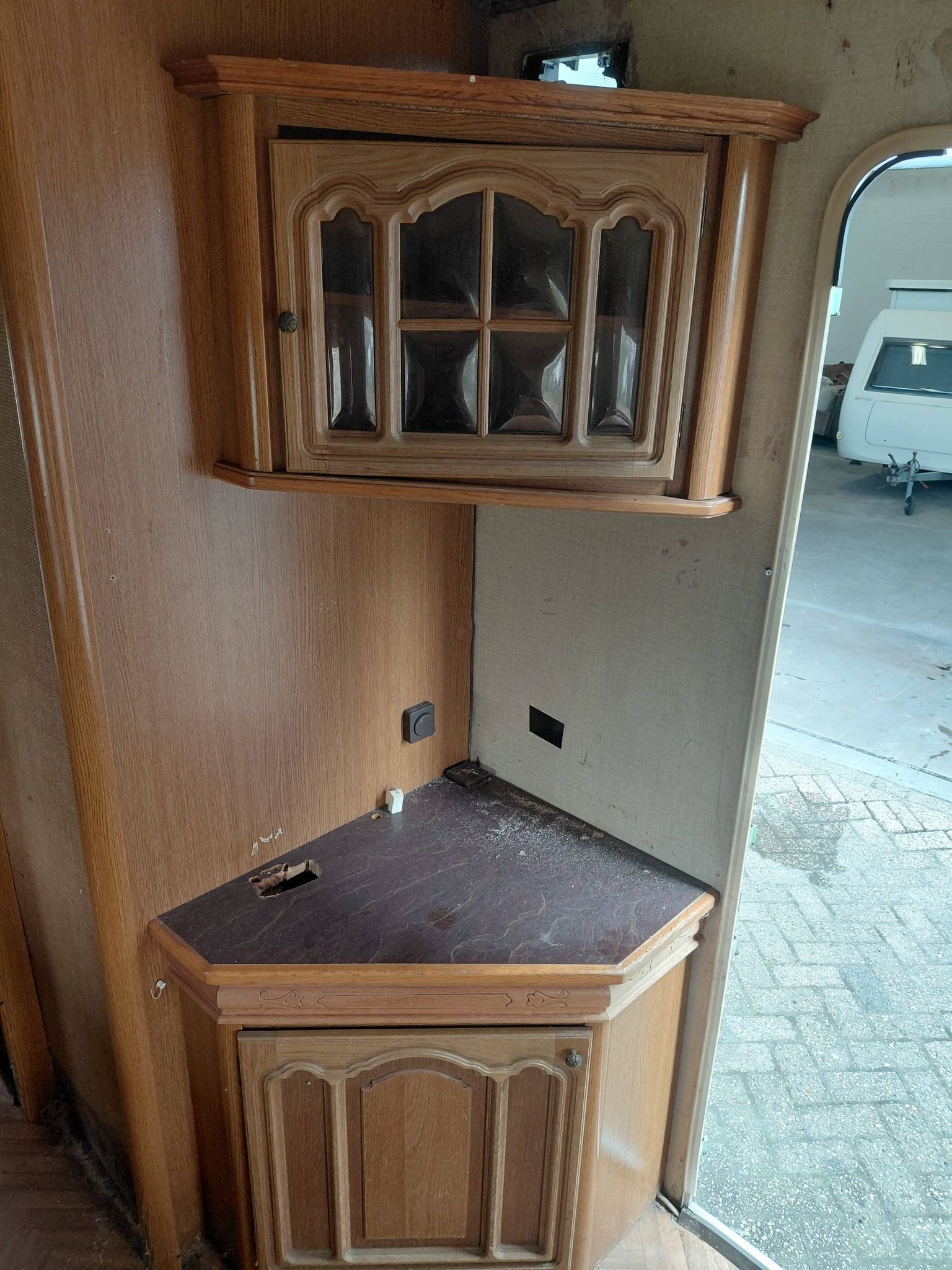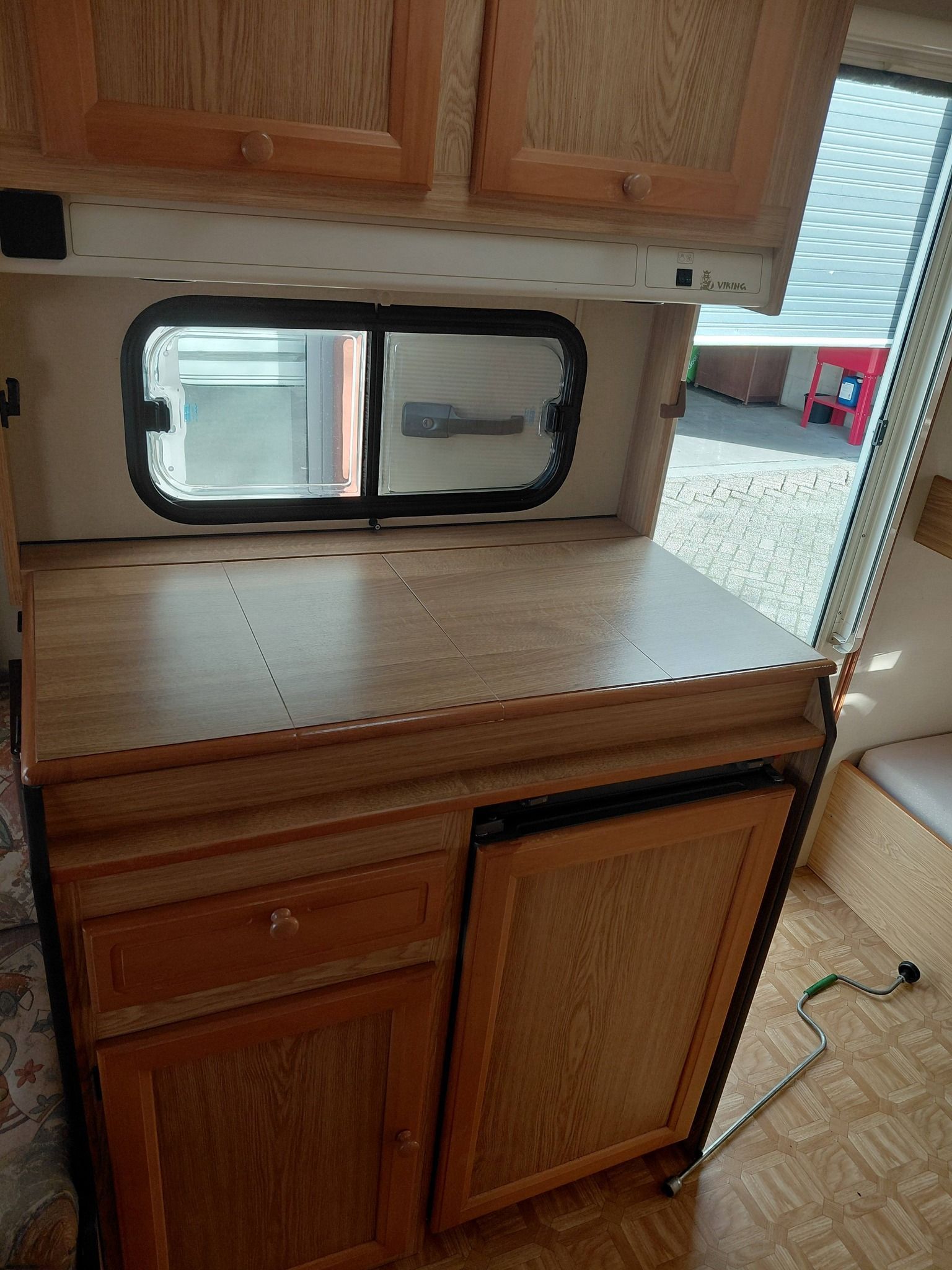 Caravan is compleet met voor ruime rondzit, in midden keukenblok met aanrecht 3 pits gaskookstel, wasbak met koud en warm water koelkast met vriesvak