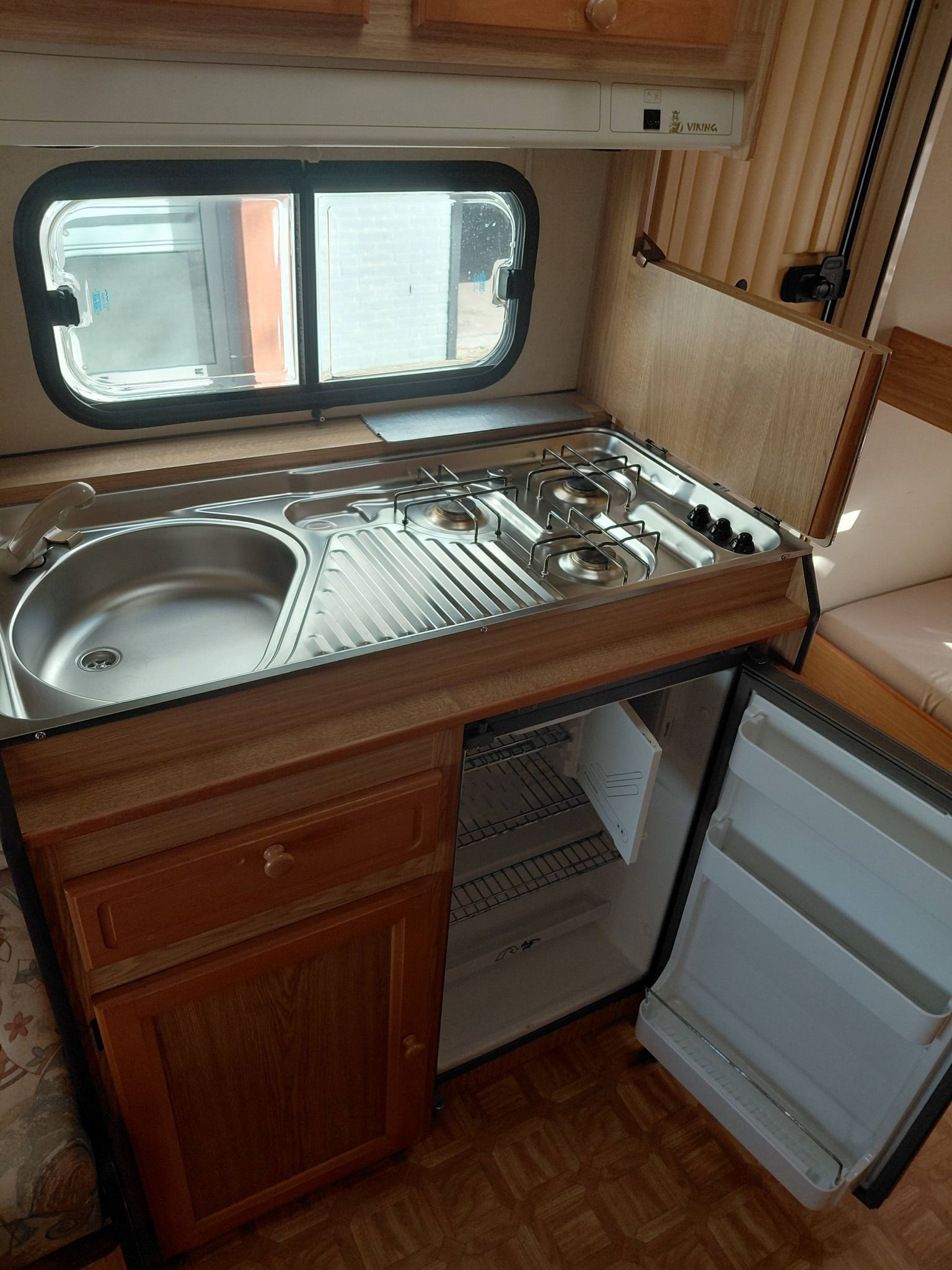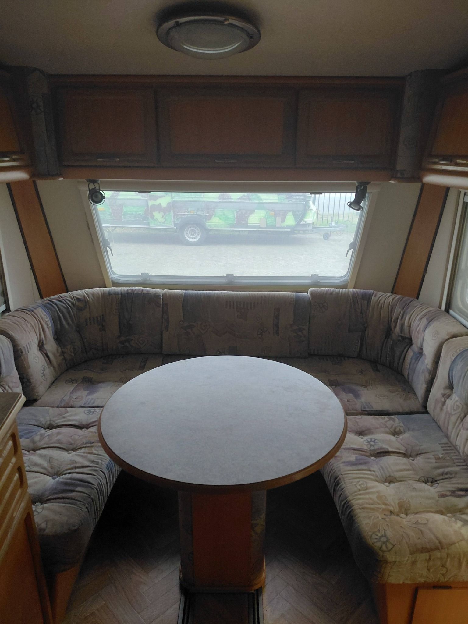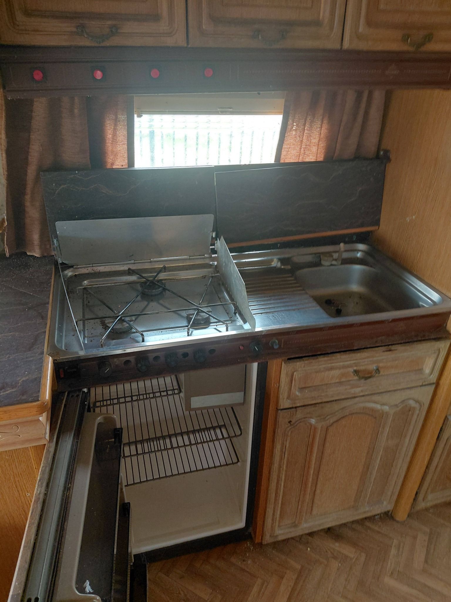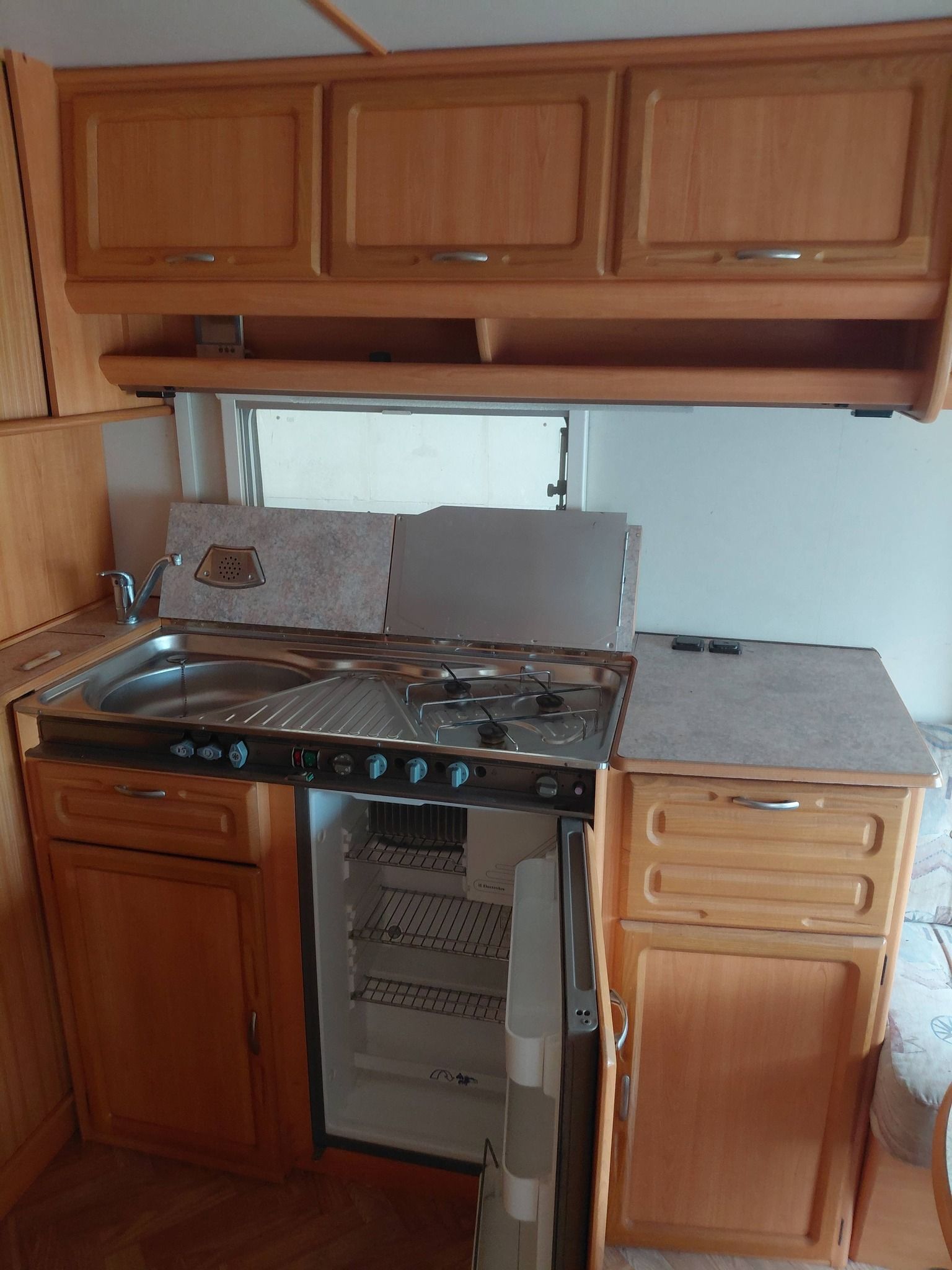 Caravan is compleet met keukenblok met wasbak met stromend water 3 pits werkende gaskookstel, ruime ijskoude koelkast met vriesvak, werkende gaskachel, apparte wasruimte met werkende Thetford vaste wc en wasbak met kraantje werkend, voor ruime 2x2 zit die in minuut omzet tot 2 persoons bed en achter stapelbed.