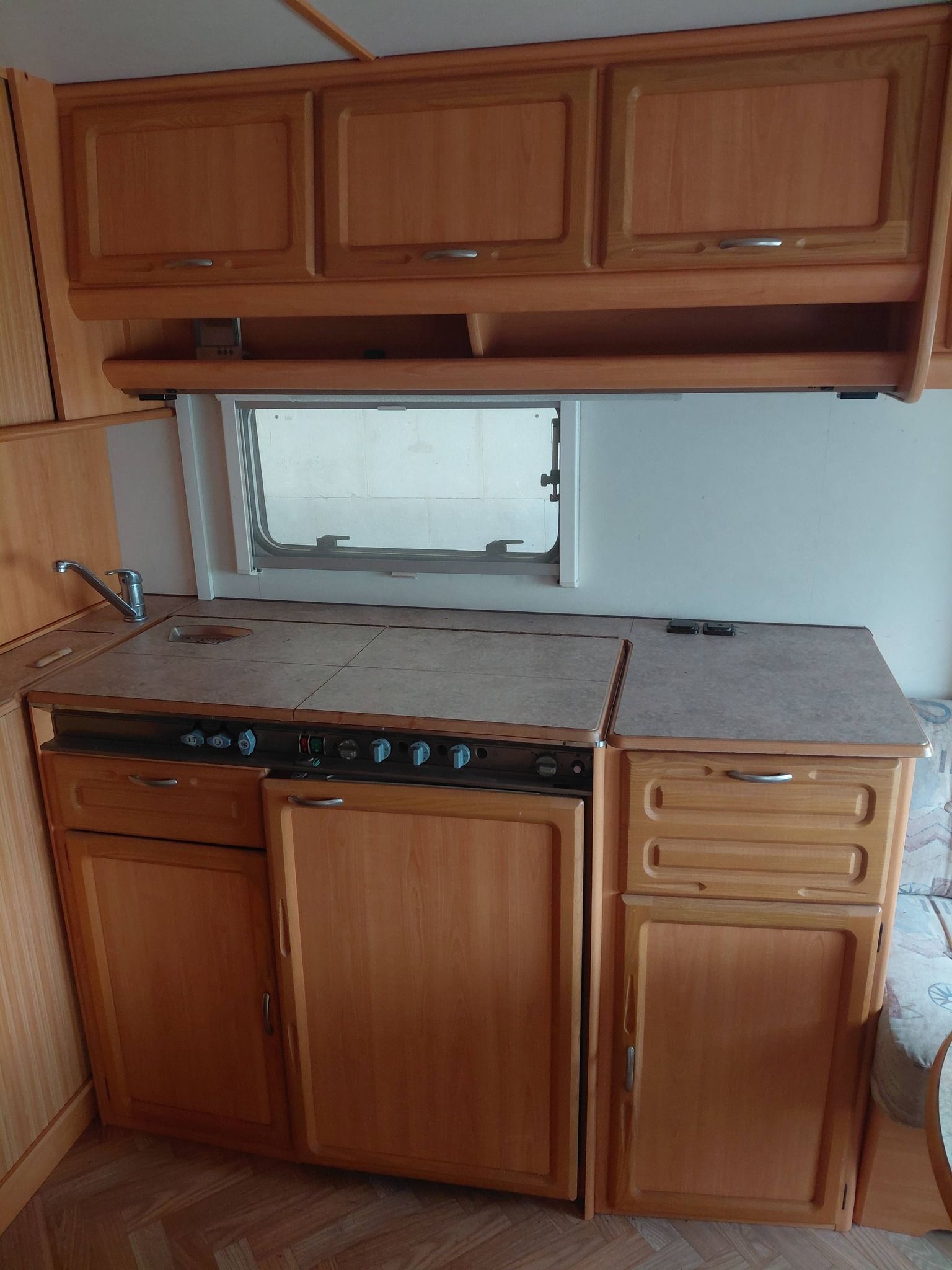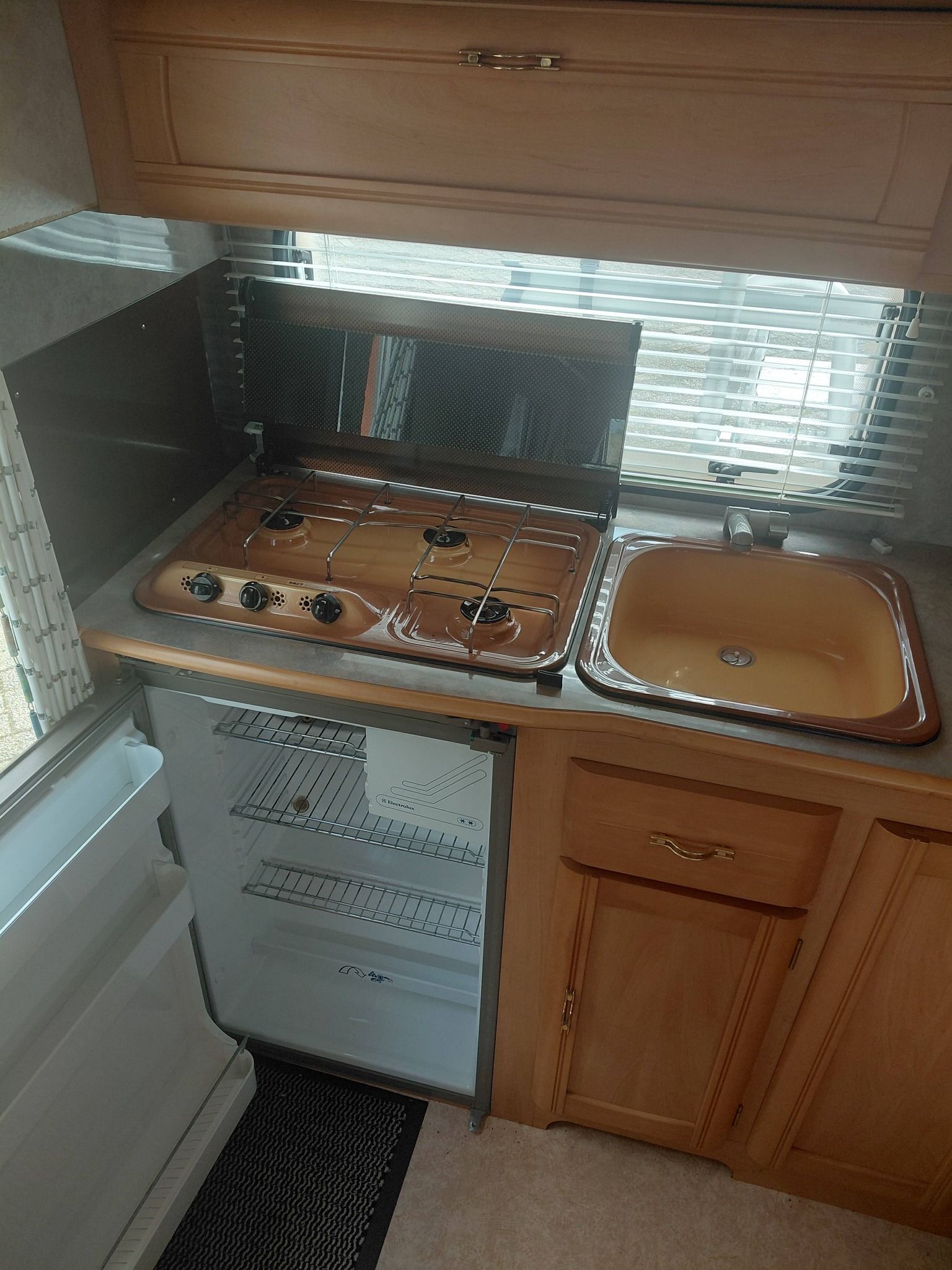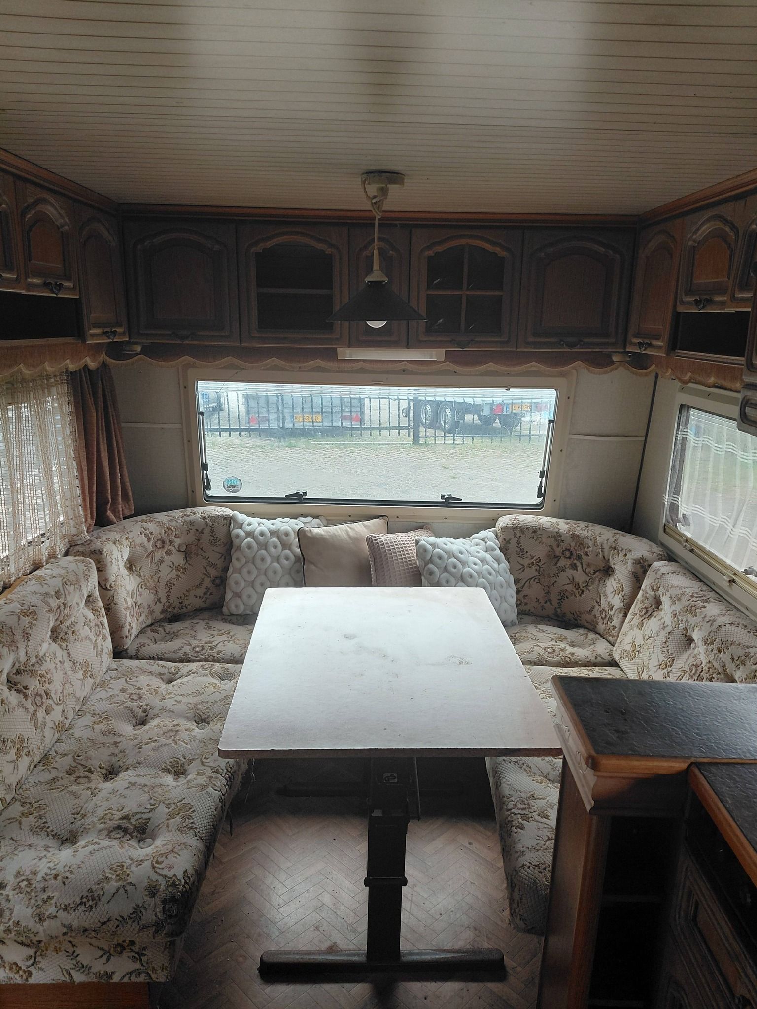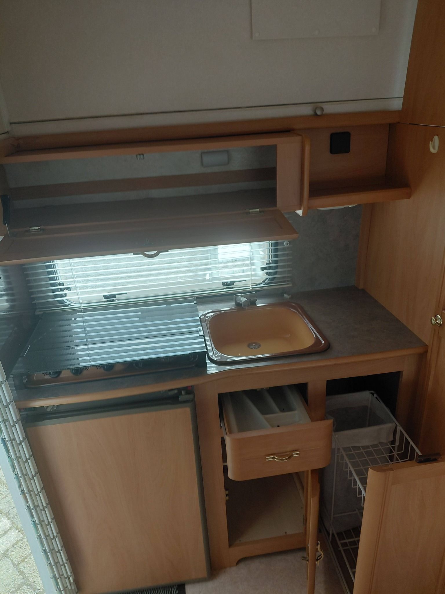 Caravan is compleet met keukenblok met wasbak met stromend water 3 pits werkende gaskookstel, ruime ijskoude koelkast met vriesvak, werkende gaskachel, apparte wasruimte met werkende Thetford vaste wc en wasbak met kraantje werkend, voor ruime 2x2 zit die in minuut omzet tot 2 persoons bed en achter stapelbed.