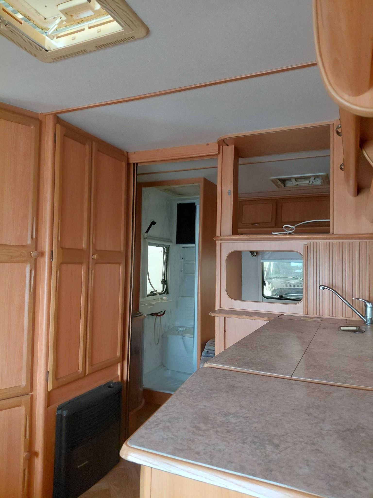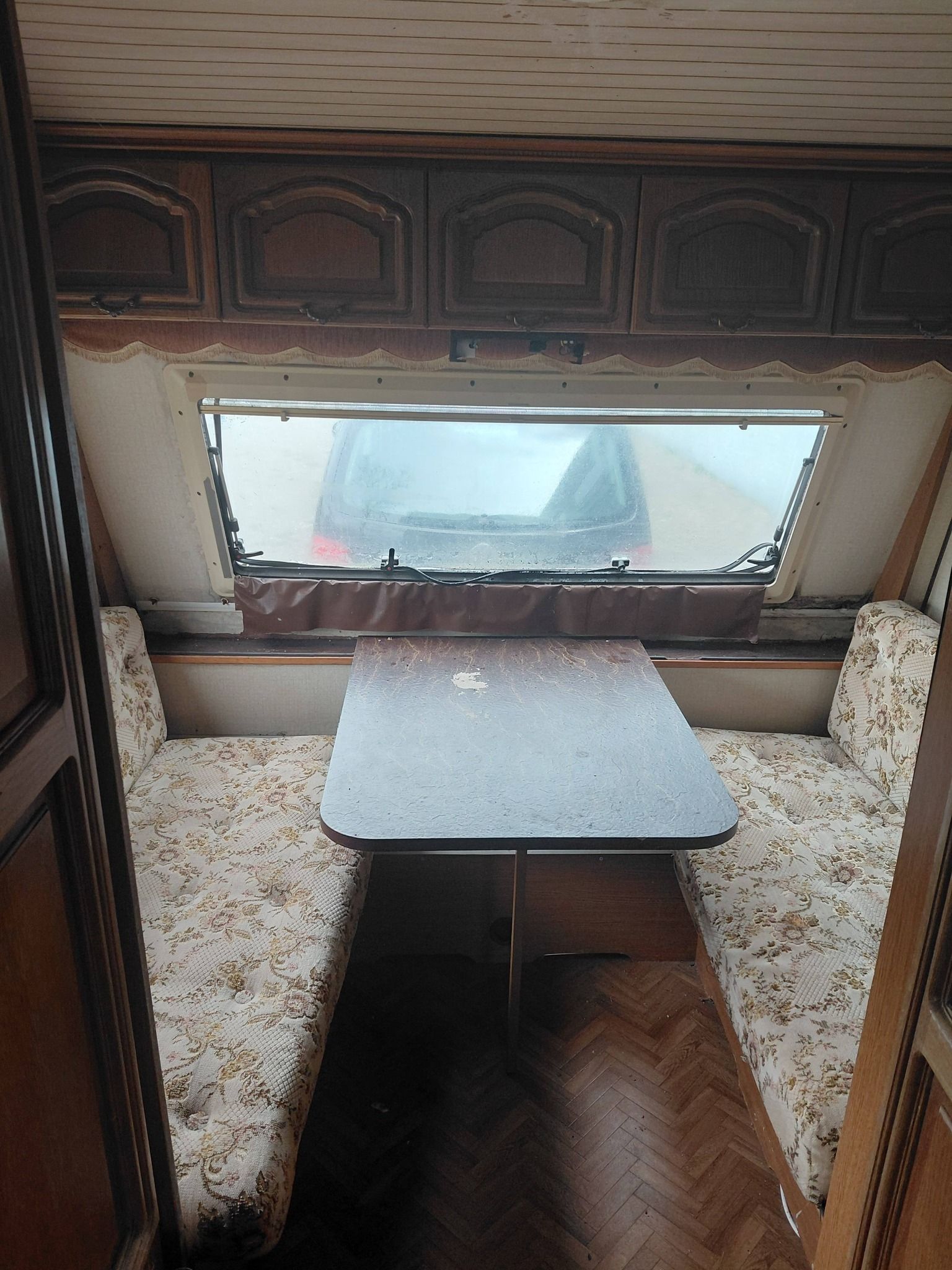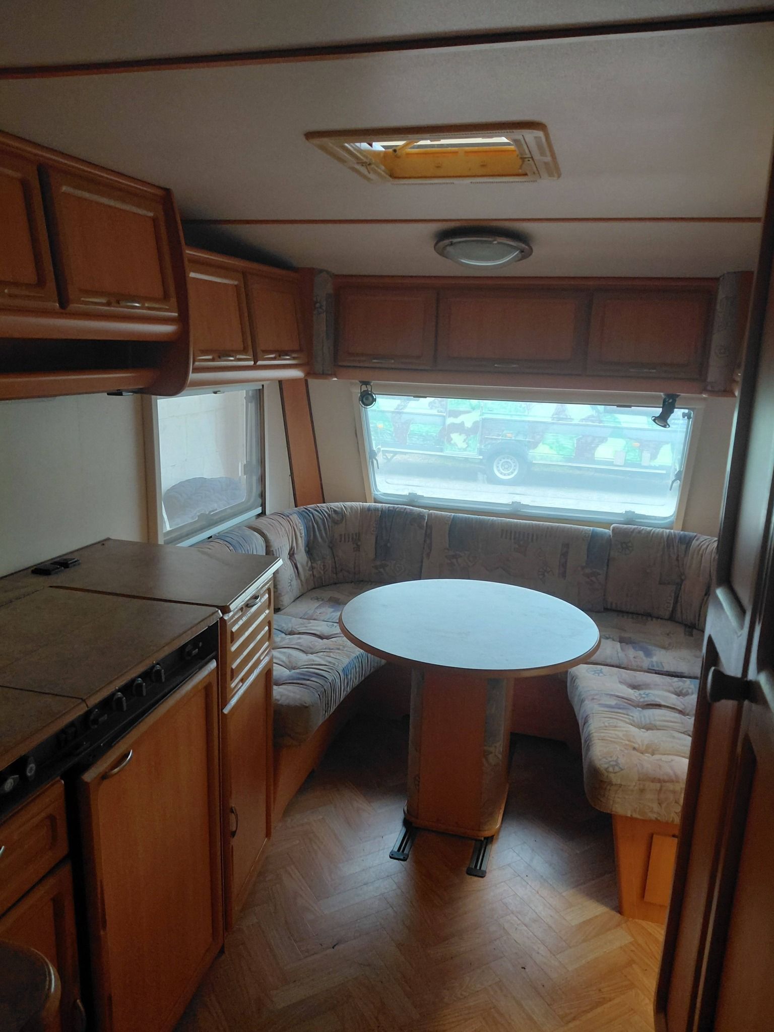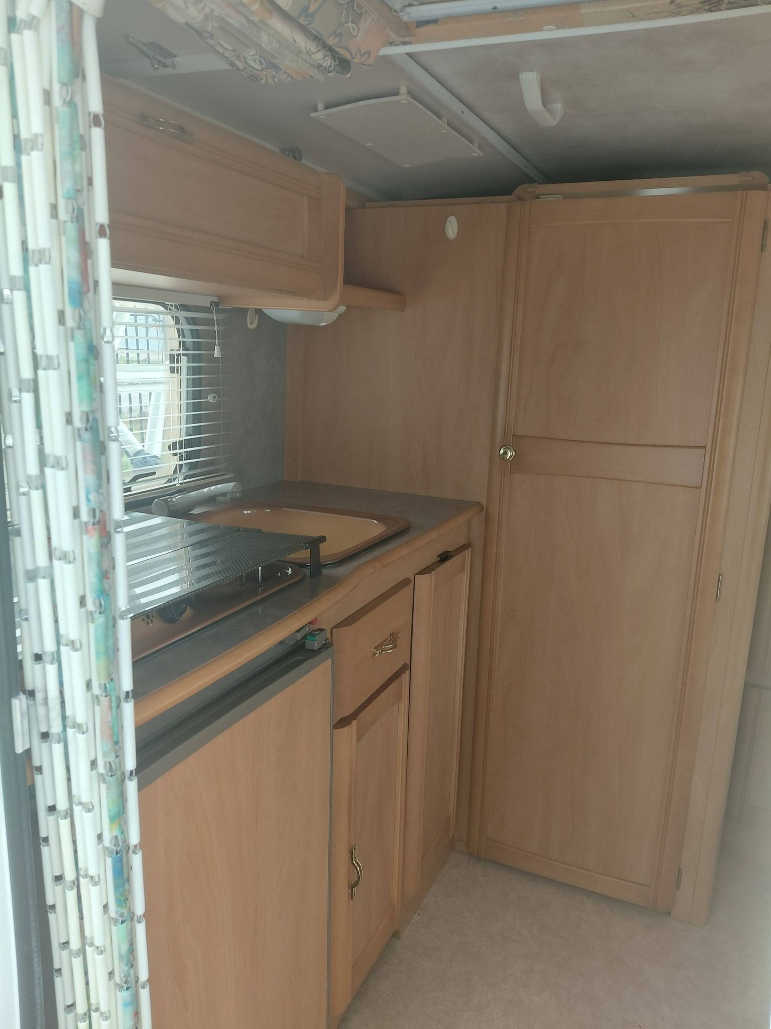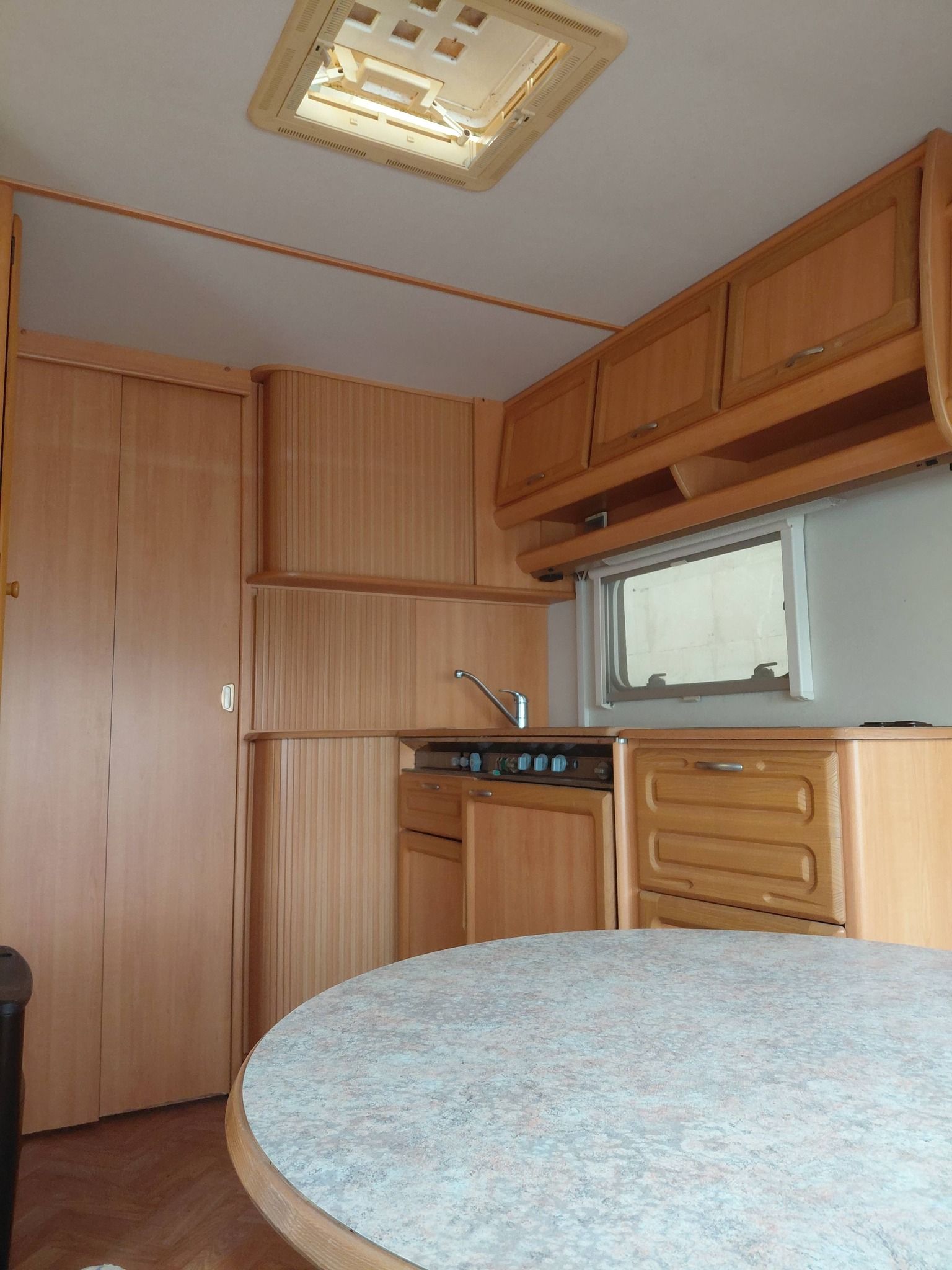 Caravan is compleet met keukenblok met wasbak met stromend water 3 pits werkende gaskookstel, ruime ijskoude koelkast met vriesvak, werkende gaskachel, apparte wasruimte met werkende Thetford vaste wc en wasbak met kraantje werkend, voor ruime 2x2 zit die in minuut omzet tot 2 persoons bed en achter stapelbed.