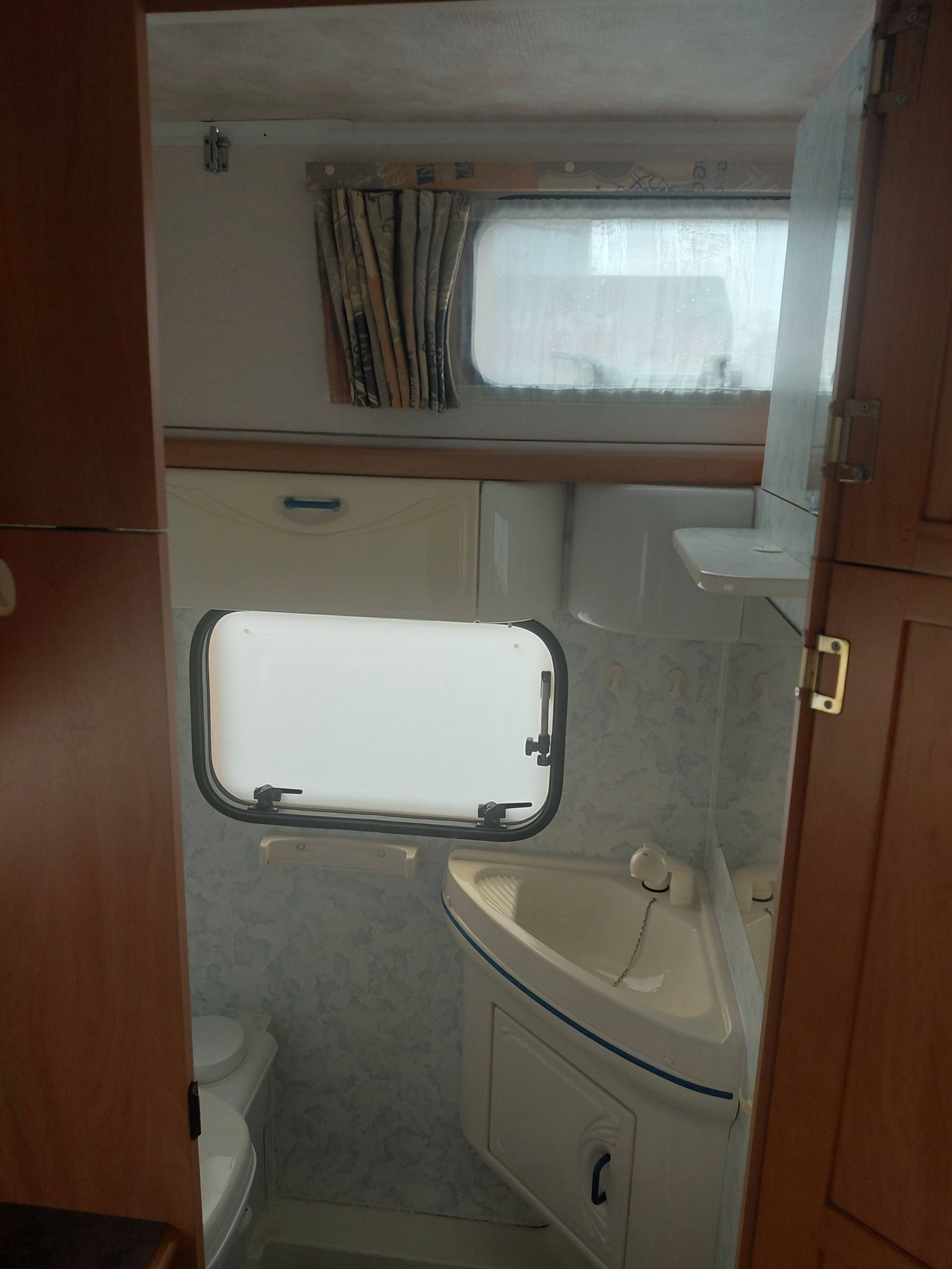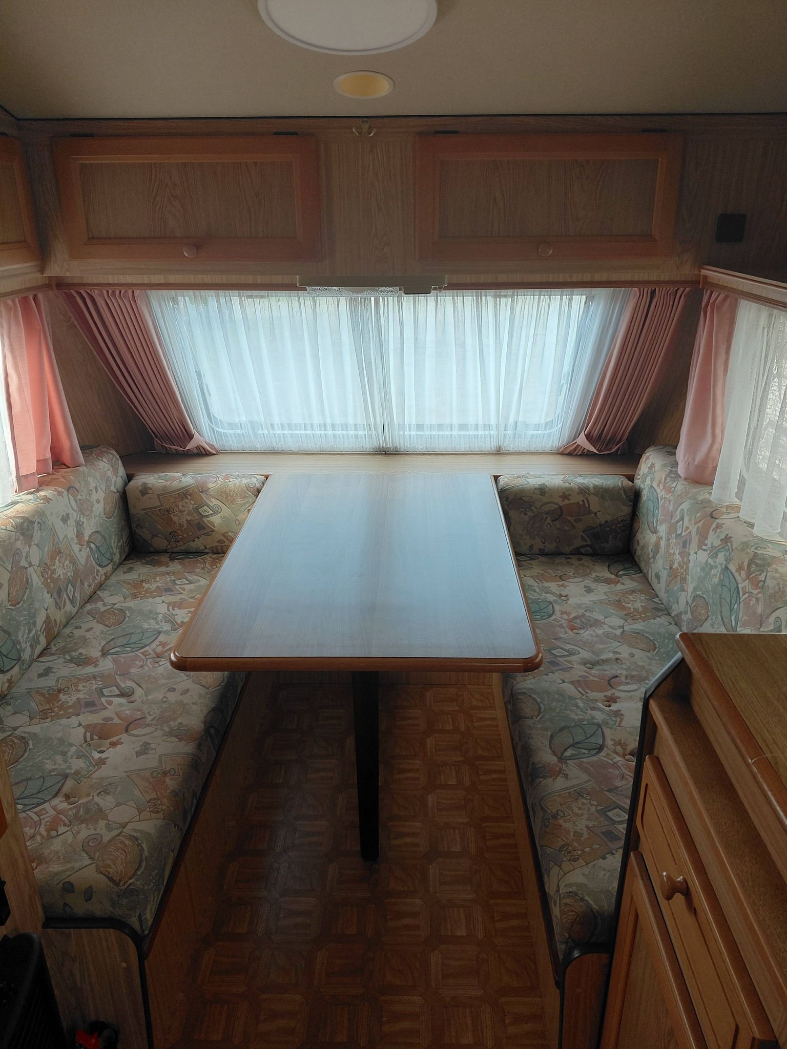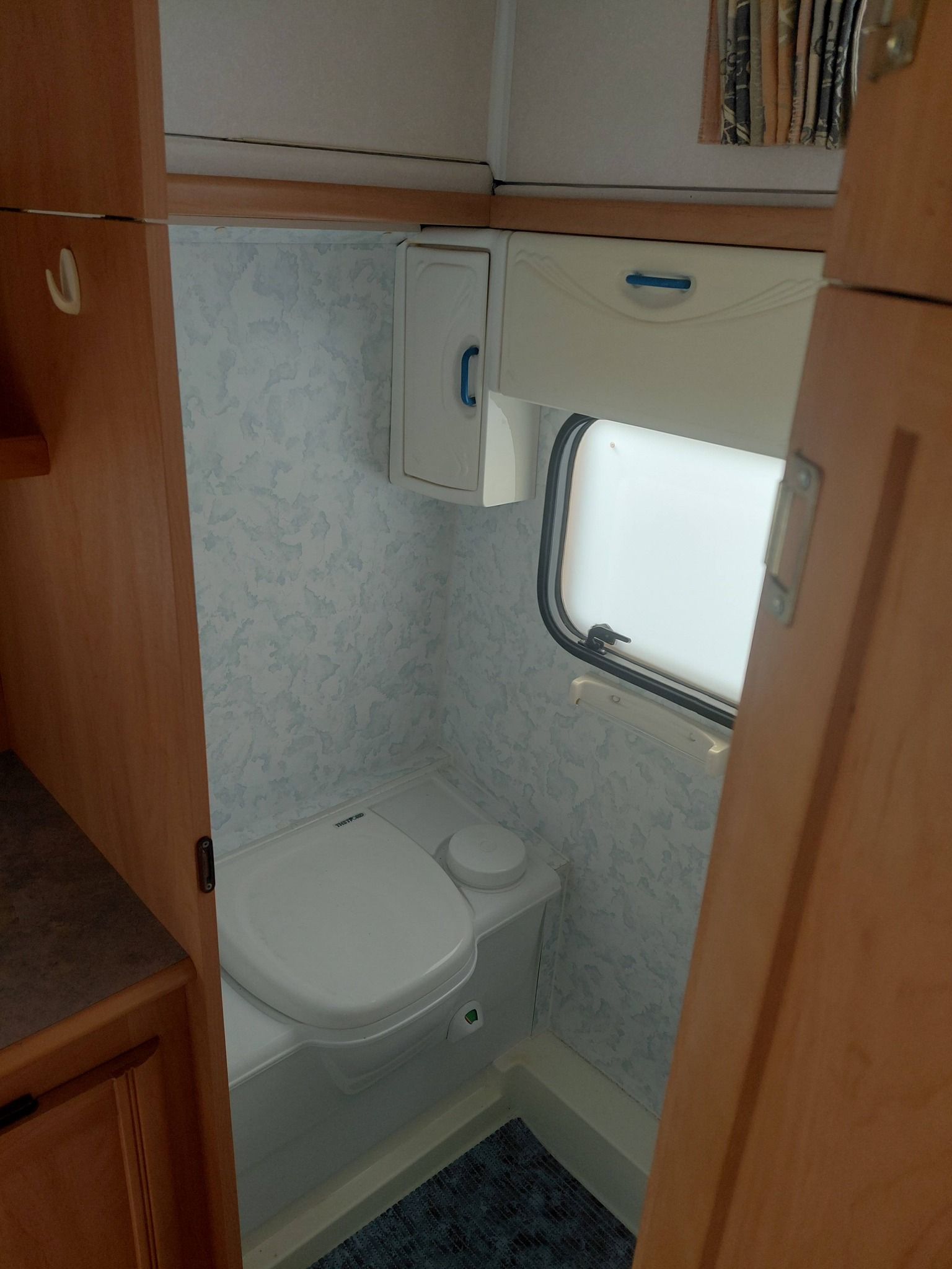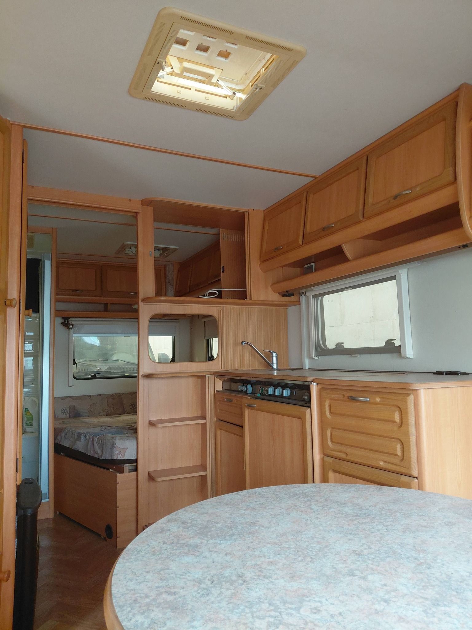 Caravan is compleet met keukenblok met wasbak met stromend water 3 pits werkende gaskookstel, ruime ijskoude koelkast met vriesvak, werkende gaskachel, apparte wasruimte met werkende Thetford vaste wc en wasbak met kraantje werkend, voor ruime 2x2 zit die in minuut omzet tot 2 persoons bed en achter stapelbed.