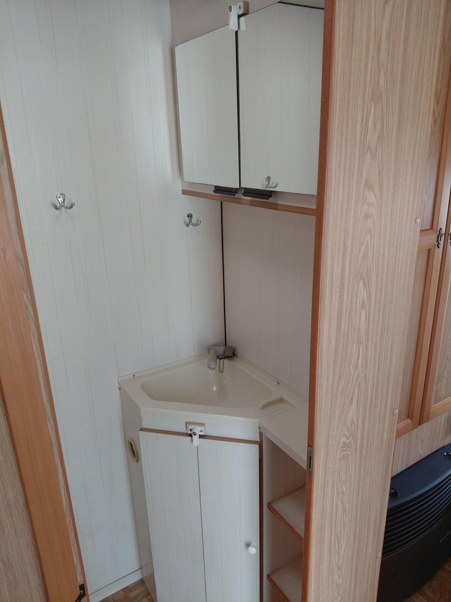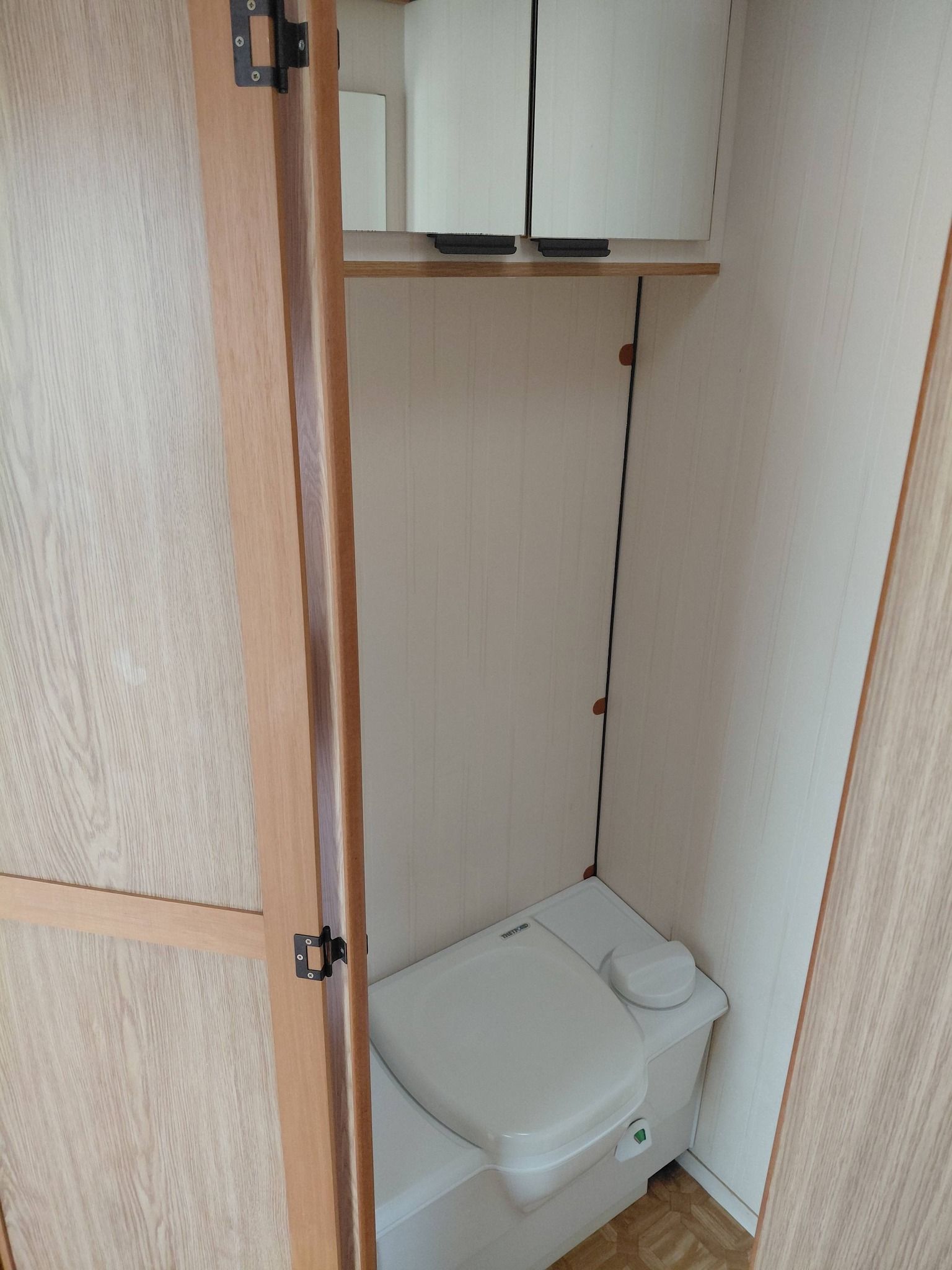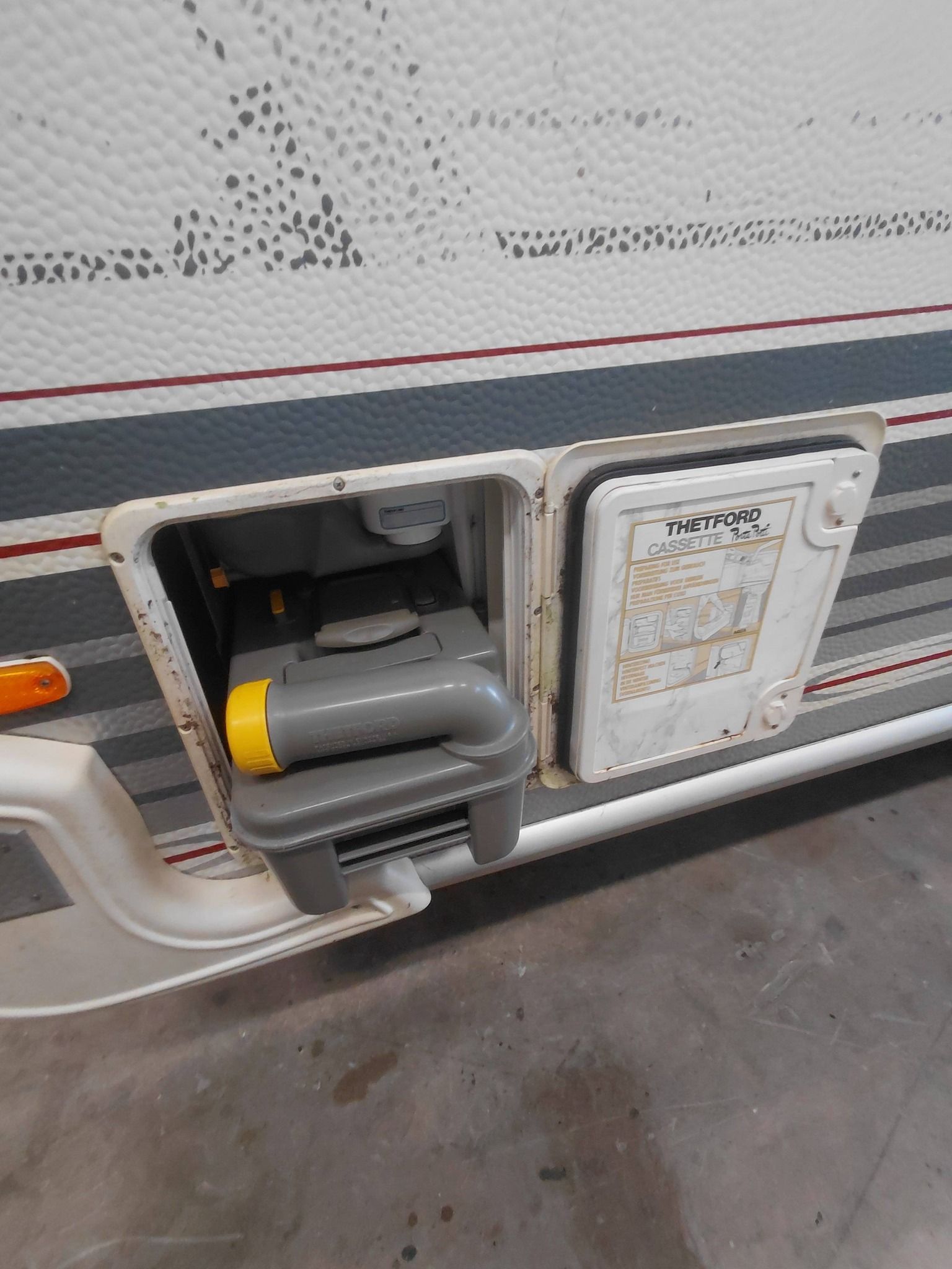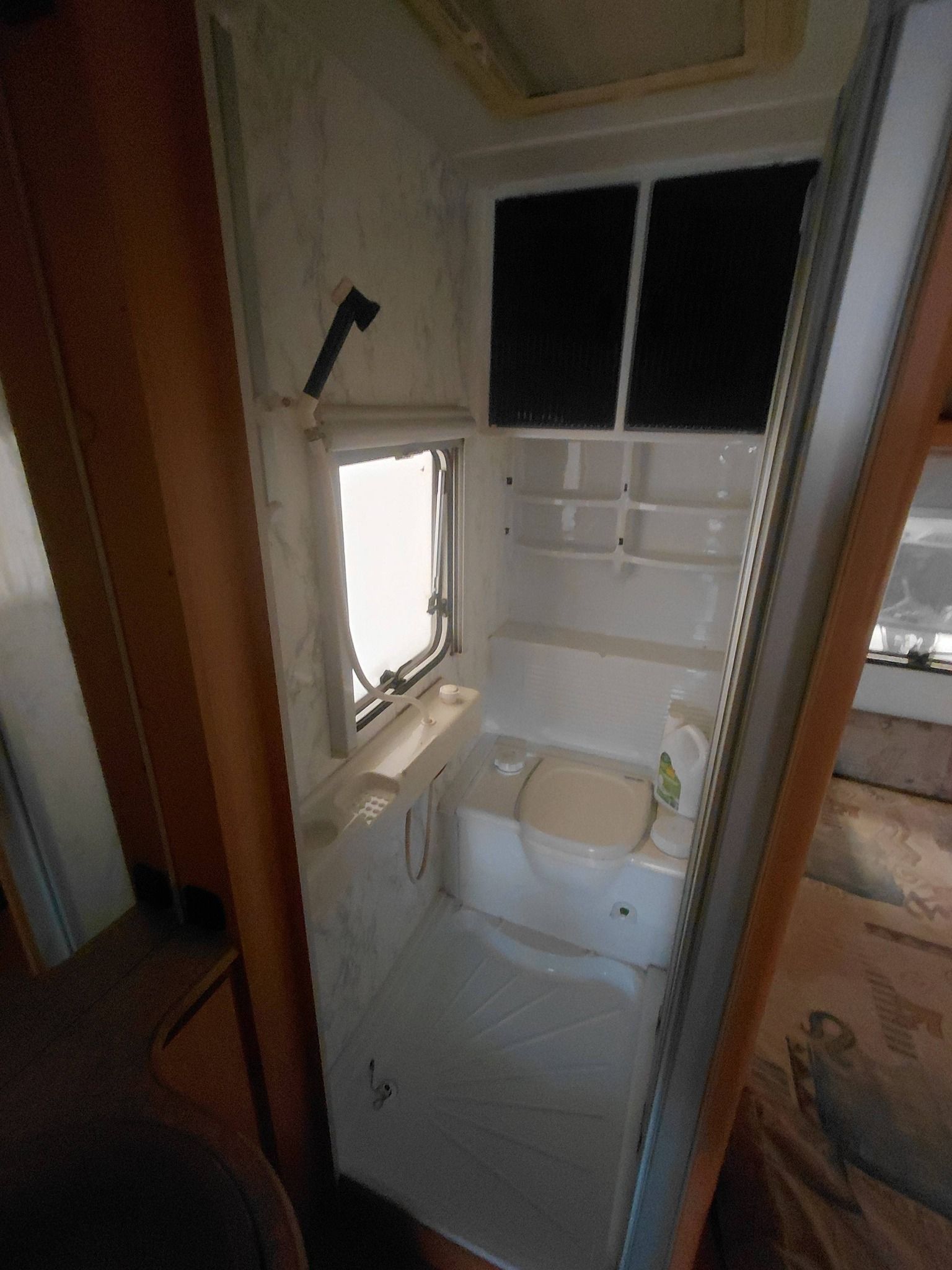 Caravan is compleet met keukenblok met wasbak met stromend water 3 pits werkende gaskookstel, ruime ijskoude koelkast met vriesvak, werkende gaskachel, apparte wasruimte met werkende Thetford vaste wc en wasbak met kraantje werkend, voor ruime 2x2 zit die in minuut omzet tot 2 persoons bed en achter stapelbed.