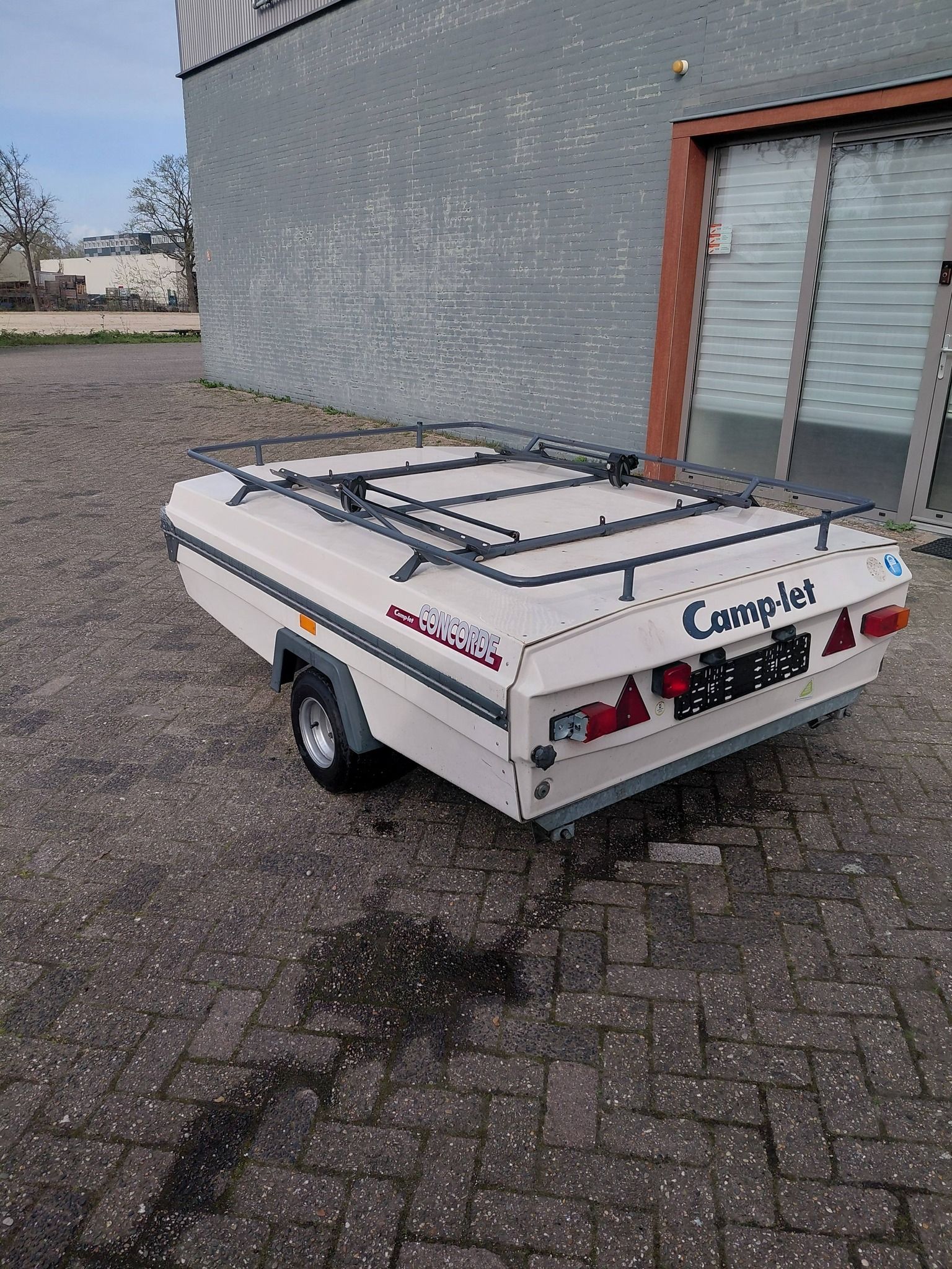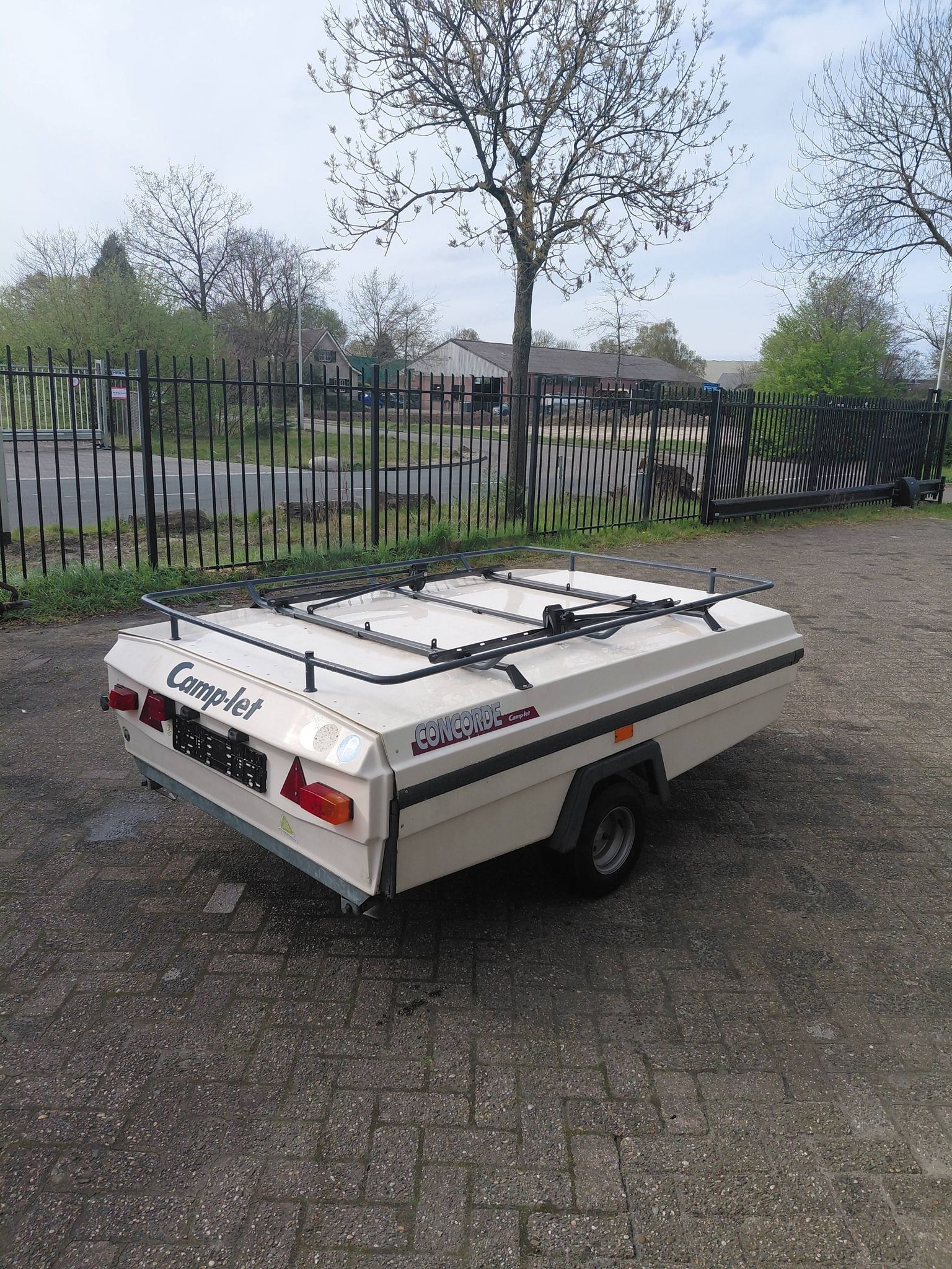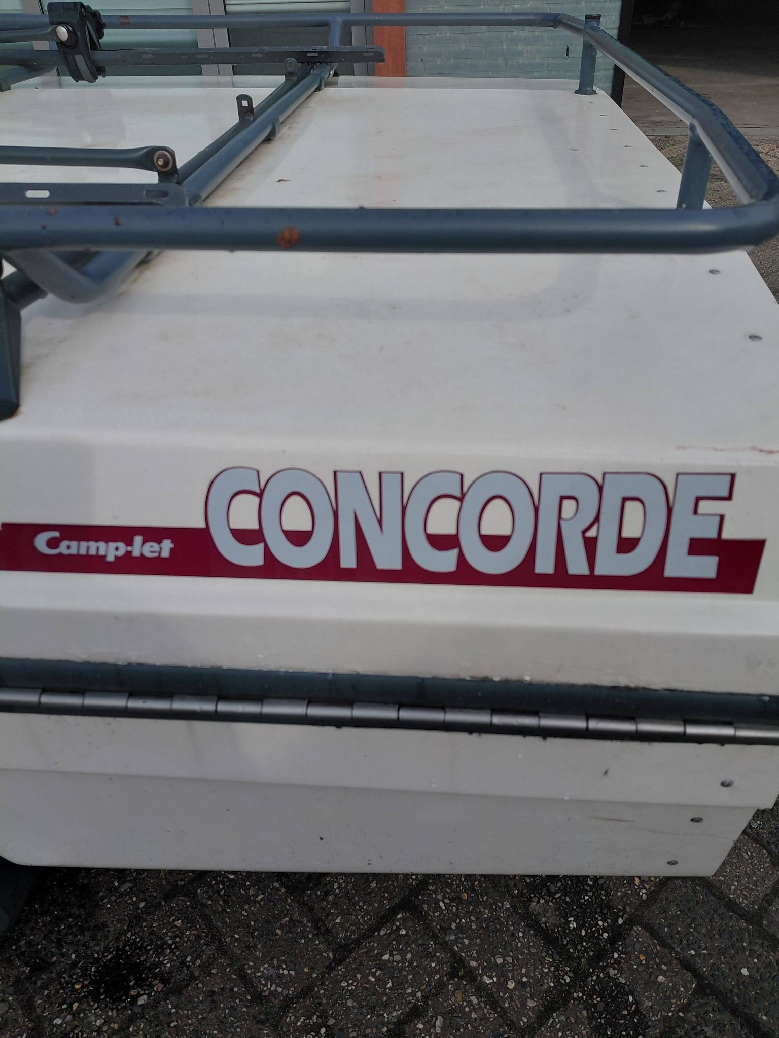 Camp-Let Concorde van het bouwjaar 2010 compleet met fietsenrek met een maximum gewicht van 750kg en is te rijden met witte plaat van auto met het B rijbewijs.