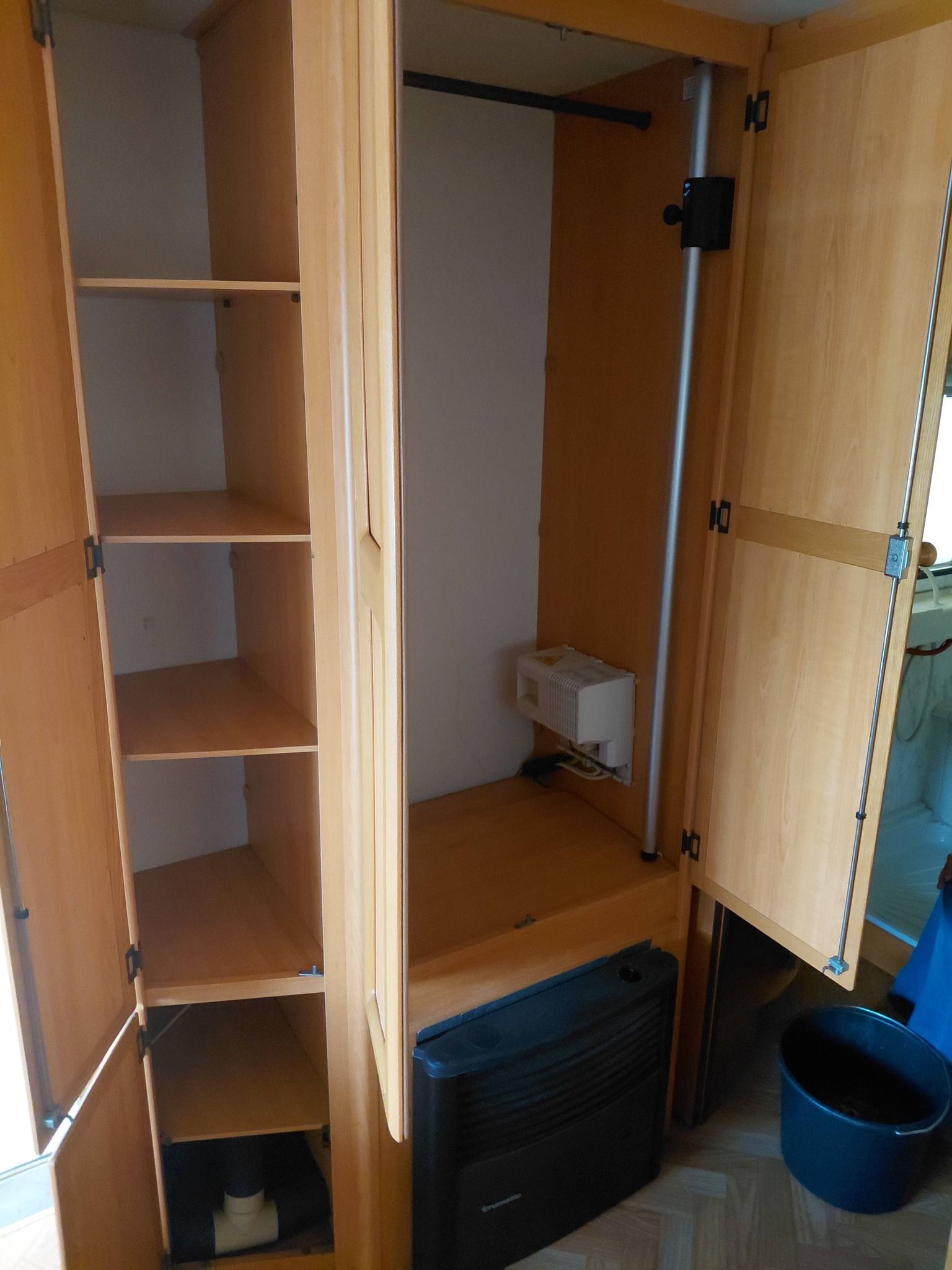 Daartegen over ruime kledingkast met daaronder gaskachel, achter vast Frans 2 persoons bed met lattenbodem en hiernaast badkamer met vaste wc, douchebak met sproeier en apparte wasbak met kraantje ook hier warm en koud water.